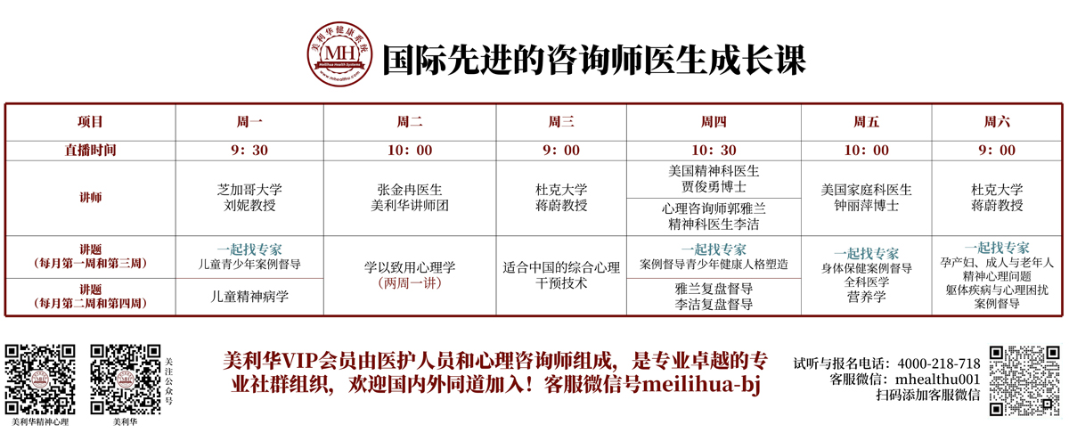2022.8.1-2023.7.31期间美利华课程包括:适合中国的综合 心理干预技术;快速掌握新版ICD与DSM;精神心理管理 挑战和临床实施模式;精神心理临床访谈的结构和有效实施; 二十一世纪的心身医学;老年医学与健康;儿童精神病学; 青少年人格的健康成长与……